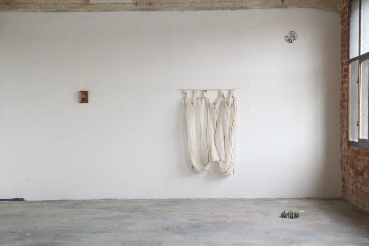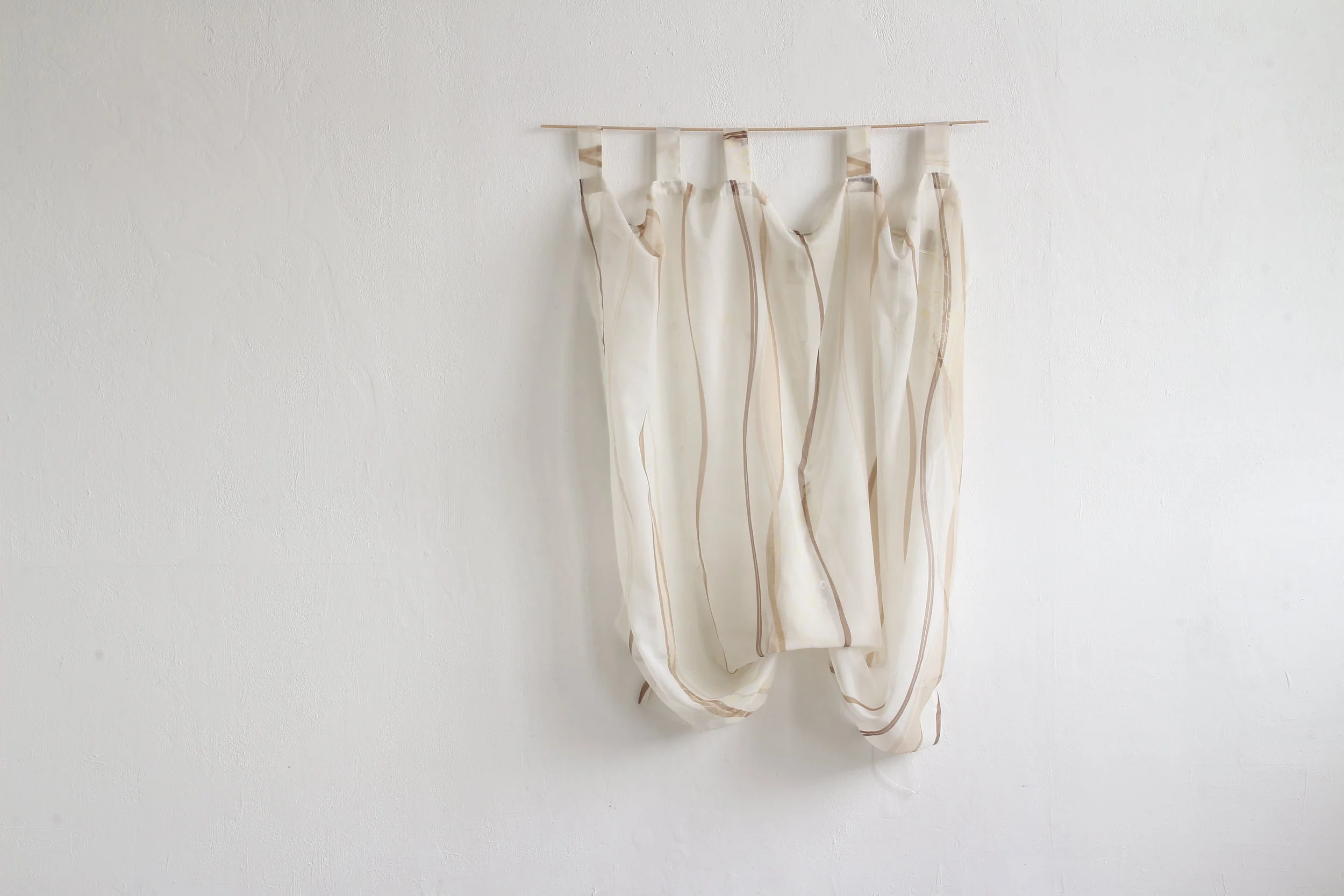 sealed in, 2024, 35 x 51 inches (89 x 130cm), inoprint, found curtain, and dowel